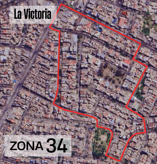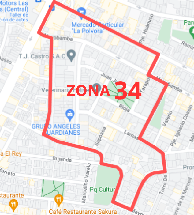 La Zona 34 está delimitada por las siguientes calles y avenidas: Se inicia en la Av. de las Américas, desde la cuadra 12 a la 14 (pares). Esta zona también verá incrementado el tránsito vehicular si el viaducto y la vía rápida de Las Américas son finalmente llevados a cabo. Continúa por el Jr. Tarapoto (par); Jr. Moyobamba (par); Jr. Juan Caceres (par); Jr. Rojas Lama (par); Jr. Batería Independencia; Jr. Moyobamba(par); Jr. Carlos López Aldana (par); Jr. Juan Pablo Vizacardo y Guzmán (impar); Prolongación Parinacochas (impar).