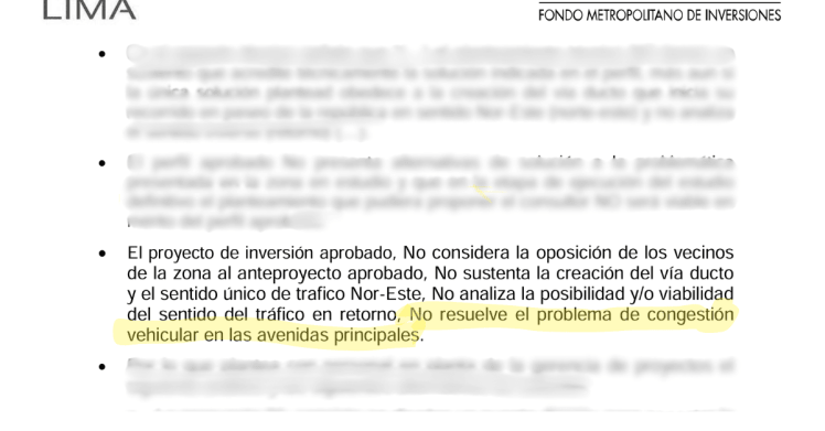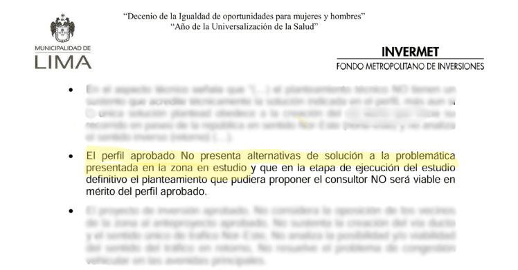 El Informe N° 013-2020-INVERMET/GP-UF —emitido por INVERMET— recoge conclusiones técnicas internas que ponen en duda la viabilidad del proyecto: se afirma que el planteamiento “NO tiene un sustento”, que el perfil aprobado no presenta alternativas, y que el proyecto no resuelve la congestión vehicular. El documento añade una frase inusual en informes administrativos: advierte posibles responsabilidades de la Unidad Formuladora de EMAPE.